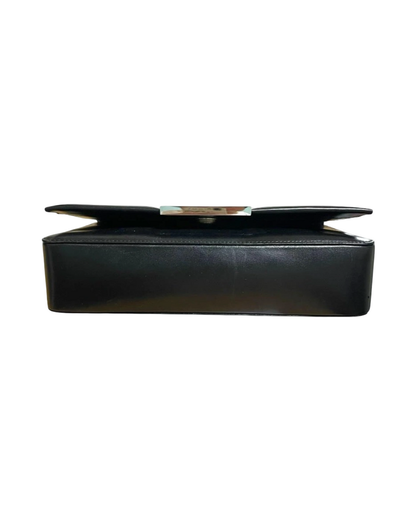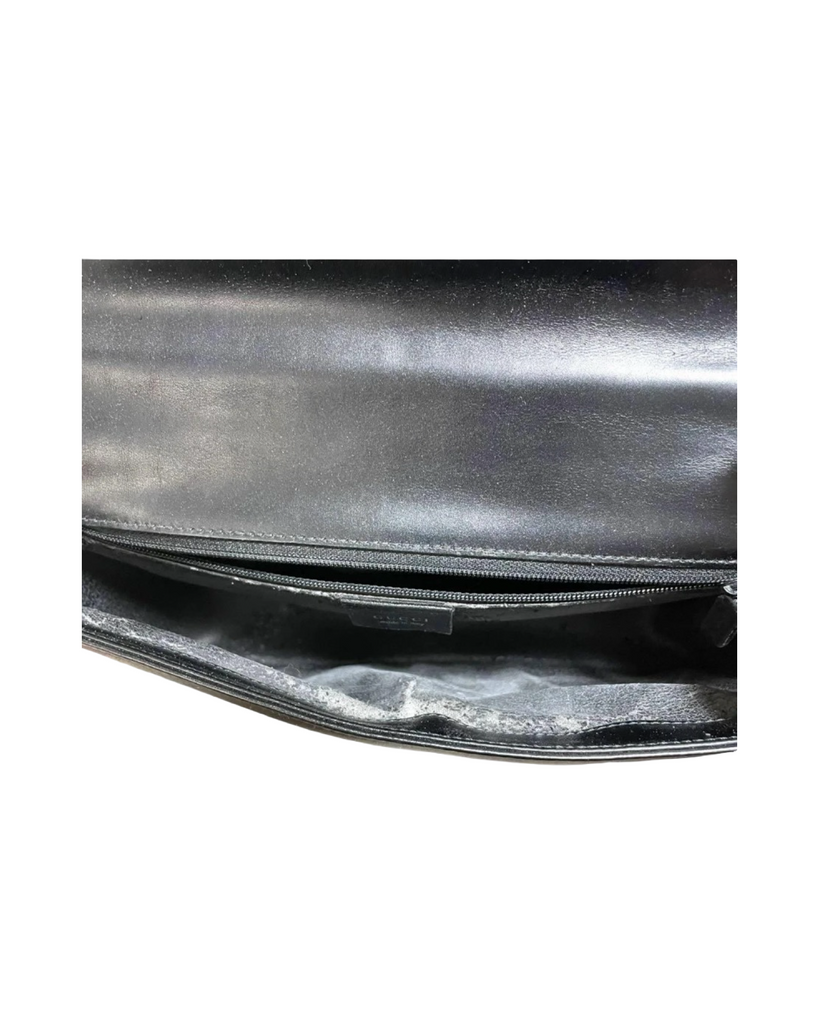 Elevate your collection with this timeless vintage Gucci shoulder bag. Crafted in sleek black leather, this medium-sized piece is accented with an oversized silver-tone “G” logo clasp that captures the bold sophistication of the era.
