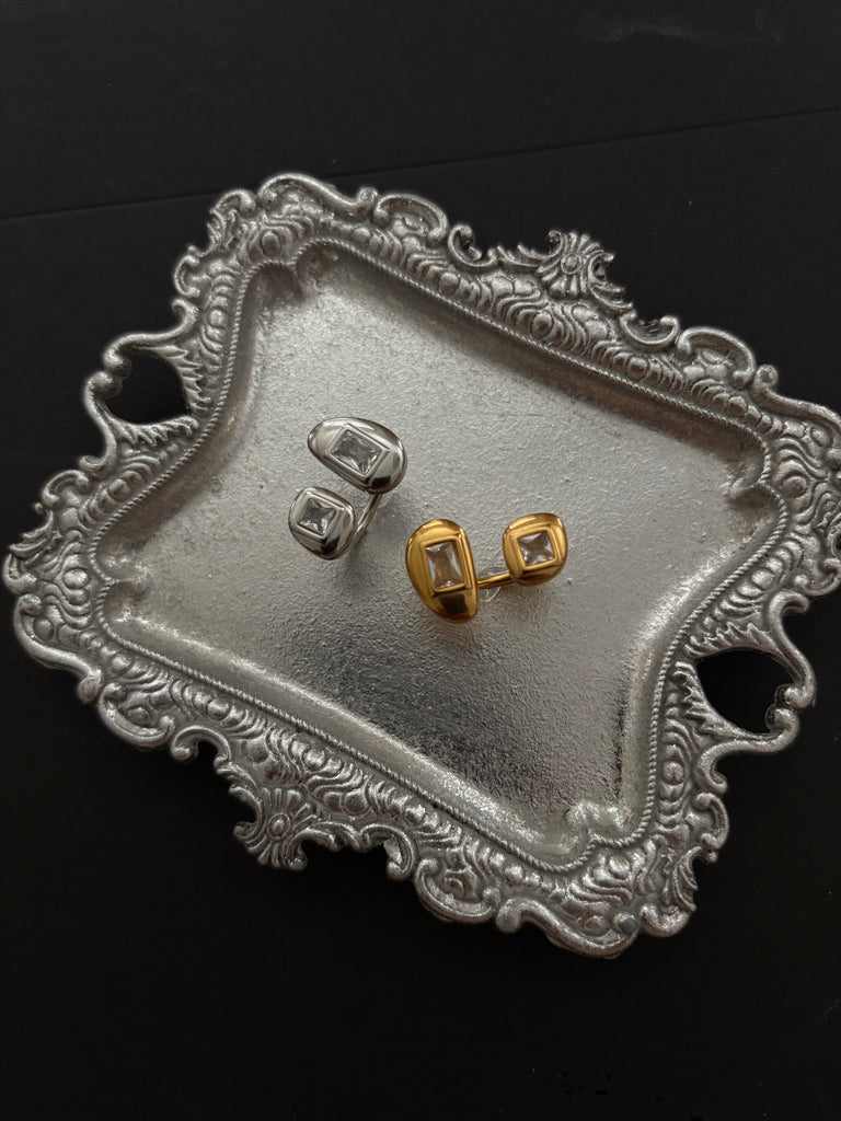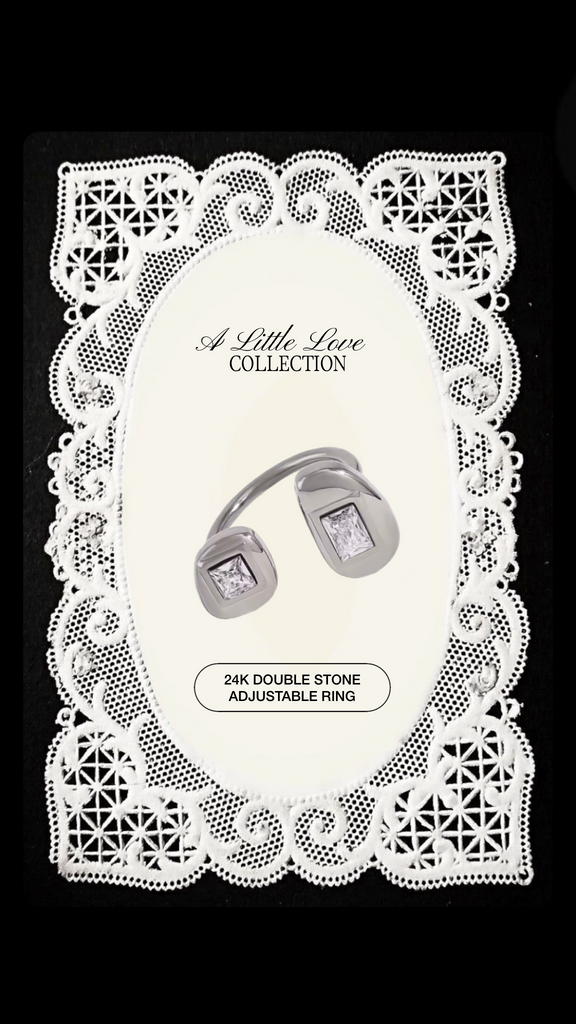 Sleek, modern, and versatile — this 24k gold-plated ring is designed with two radiant stones set in bold geometric bezels. Its open, adjustable band ensures a comfortable fit for any finger, making it the perfect one-size-fits-all accessory. Whether worn as a statement piece or stacked with your favorites, this ring adds effortless elegance to any look